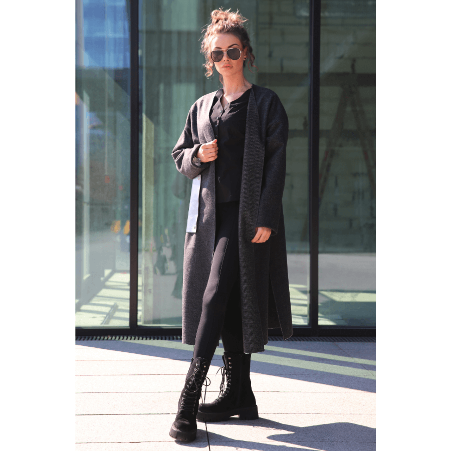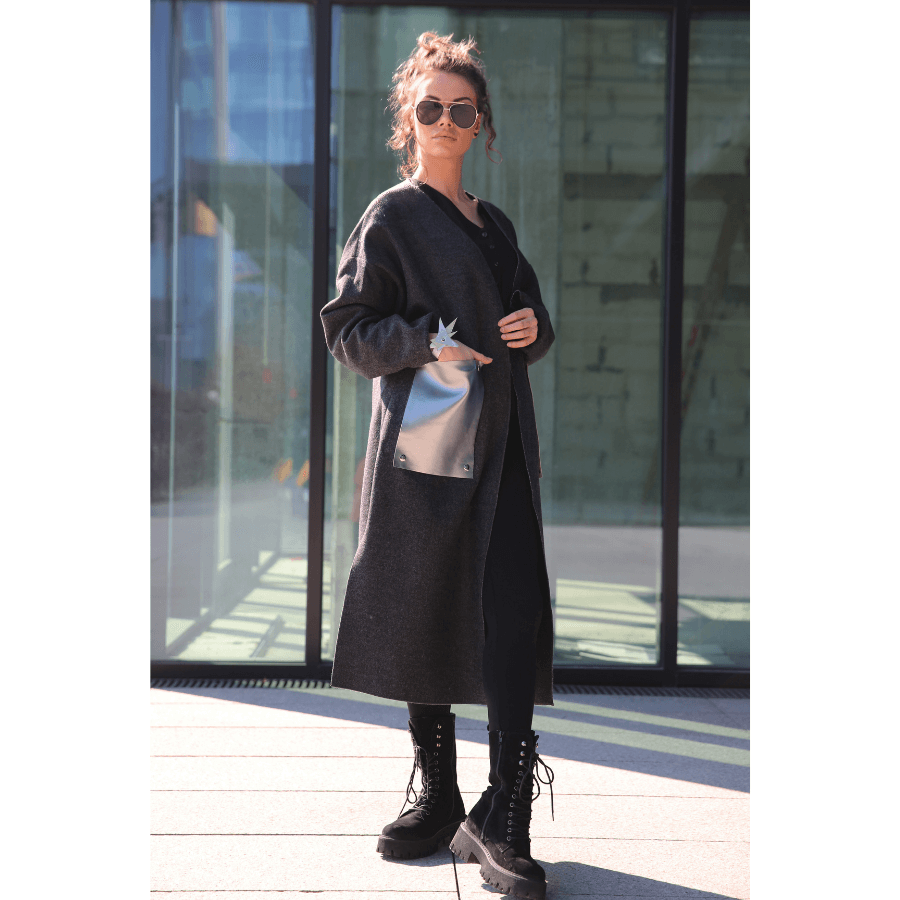 Szary płaszcz o prostym, nowoczesnym kroju to idealna propozycja dla kobiet ceniących minimalizm z nutą oryginalności. Długość midi nadaje mu elegancji, a oversize’owy fason zapewnia swobodę i wygodę noszenia. Efektownym akcentem są duże, skórzane odpinane nakładki na kieszenie, które przełamują klasyczny design i dodają całości futurystycznego charakteru. Płaszcz świetnie komponuje się zarówno z miejskimi stylizacjami, jak i bardziej casualowym lookiem – doskonale wygląda z ciężkimi butami, jak i sportowym obuwiem.