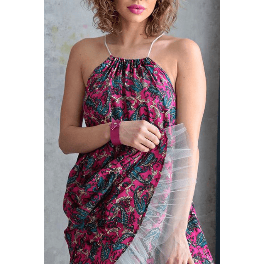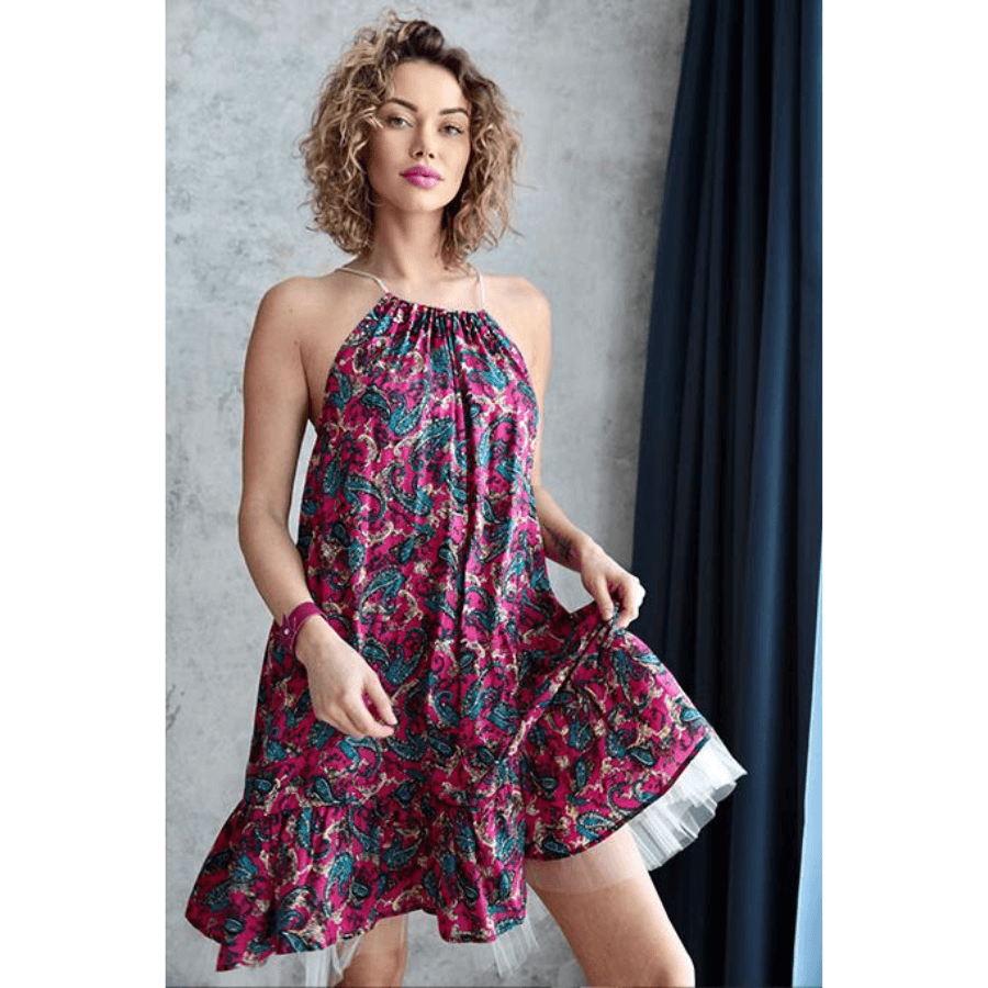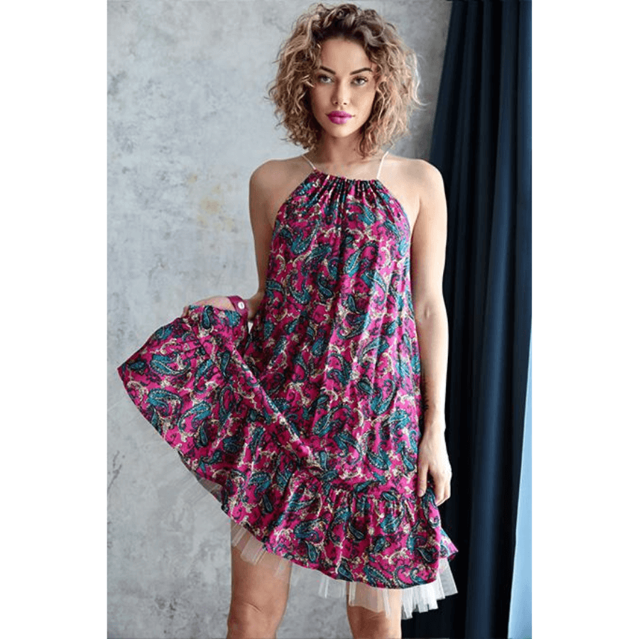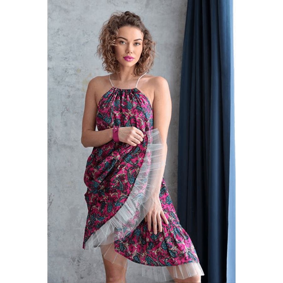 Zwiewna sukienka w energetycznym, kwiatowym princie to kwintesencja letniego stylu i kobiecej lekkości. Luźny fason zapewnia swobodę ruchów, a sznurkowe wiązanie na szyi pięknie eksponują ramiona. Dół wykończony falbanką i warstwą tiulu dodaje sukience uroku i dziewczęcego wdzięku. Idealna na wakacje, spacery po plaży czy letnie przyjęcia – sprawdzi się zarówno z eleganckim obuwiem , jak i w połączeniu z lekkimi sandałkami czy trampkami.